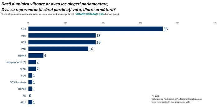 Astfel, AUR ocupă primul loc în intenția de vot, cu 36%, urmată la mare distanță de PSD și USR, ambele cu 18%. Paradoxal, în ciuda gafelor în cascadă, partidul ”trotinetiștilor” a depășit PNL, care se situează la 16%. UDMR nu depășește pragul electoral, având în sondaj 4%.