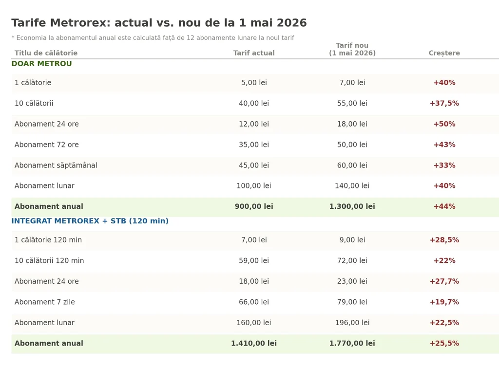 Majorări sunt prevăzute și pentru abonamentele integrate cu STB. Astfel, un abonament lunar va crește la 196 de lei, de la 160 de lei în prezent, iar cel anual va ajunge la 1.770 de lei, comparativ cu 1.410 lei în actuala grilă tarifară.